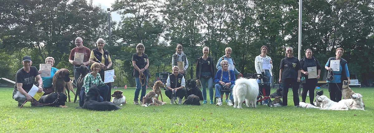 Insgesamt 11 Hunde mit ihren Halterinnen hatten sich dieses Jahr der mehrteiligen Begleithundeprüfung gestellt. Diese Prüfung aus den 4 Einheiten Theorie, Verhalten in der Gruppe, dem gemeinsamen Stadtgang und letztendlich der Einzelprüfung fordert von Hund und Halter viel Übung und Training im Vorfeld und während der Prüfungsphasen ein hohes Maß an Konzentration und gegenseitiger Aufmerksamkeit. In einem 8-wöchingen Vorbereitungskurs, immer donnerstagabends, konnten sich die Prüfungsteilnehmer auf die einzelnen Prüfungsmodule vorbereiten.